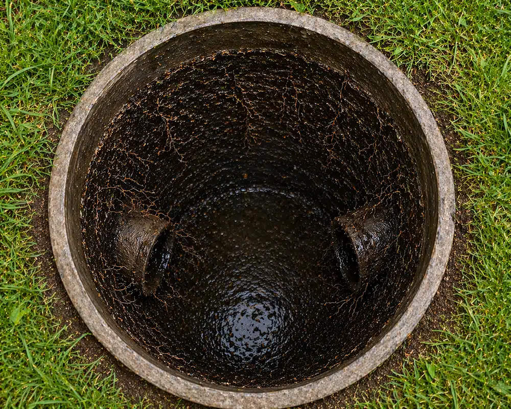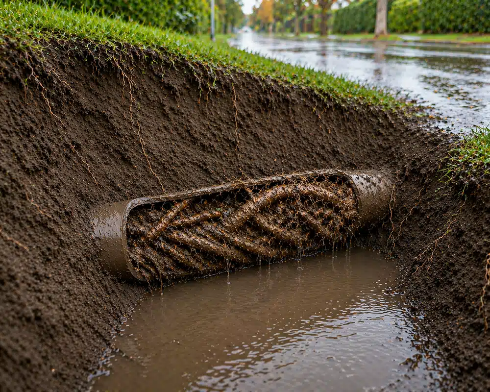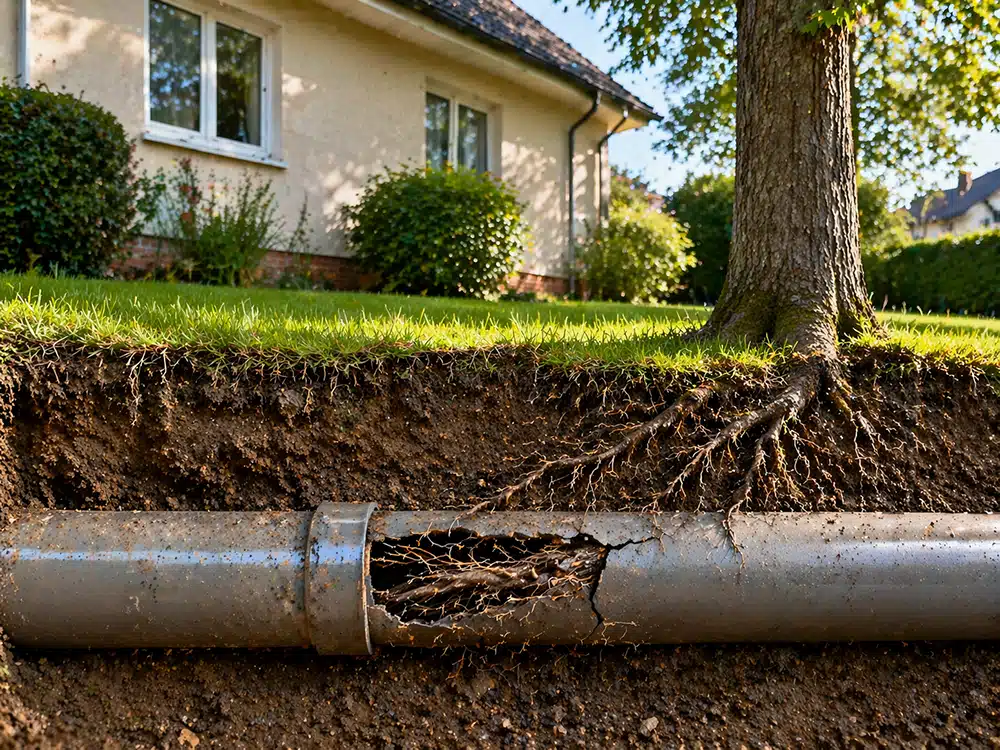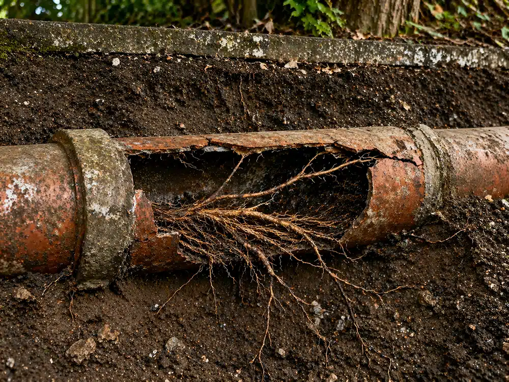 Les racines, attirées par l’humidité, se développent naturellement en direction des canalisations et s’infiltrent par les micro-fissures ou les joints fragilisés. En progressant, elles forment un véritable réseau fibreux à l’intérieur des conduits, agissant comme un filet qui retient les dépôts (graisses, sables, déchets). Ce phénomène entraîne progressivement des obstructions et favorise l’apparition de bouchons récurrents, pouvant aller jusqu’à perturber fortement l’écoulement du réseau.